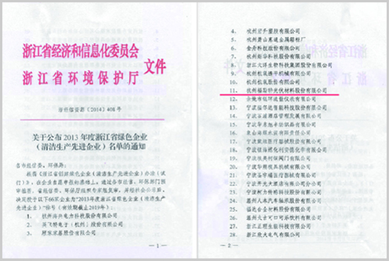 福斯特榮獲“2013年度浙江省綠色企業(yè)(清潔生產(chǎn)先進(jìn)企業(yè))”榮譽(yù)稱號