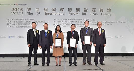澳門特別行政區(qū)政府能源業(yè)發(fā)展辦公室副主任盧深昌(左一)、澳門中華總商會(huì)副理事長黃國勝(左二)及國際清潔能源論壇(澳門)理事長蘇樹輝(右一)為2015年中國光伏“領(lǐng)跑者”卓越材料供應(yīng)商得獎(jiǎng)企業(yè)(福斯特左三)頒獎(jiǎng)