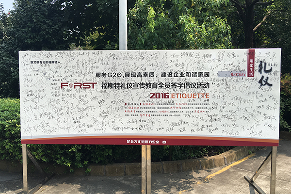 福斯特積極打造健康、和諧、生動(dòng)的企業(yè)文化,以文化活動(dòng)為載體,豐富員工精神生活,展現(xiàn)企業(yè)活力風(fēng)采。由福斯特企業(yè)文化辦公室主辦的福斯特禮儀宣傳教育季活動(dòng)在G2O期間在全公司開展,以“陽(yáng)光生活,禮儀先行”為主題,內(nèi)容包括開設(shè)全員培訓(xùn)課程、開展全員簽字倡議活動(dòng)活動(dòng)、學(xué)習(xí)福斯特《禮儀手冊(cè)》,后續(xù)還將陸續(xù)開展禮儀征文活動(dòng),禮儀知識(shí)問答和禮儀行為調(diào)查活動(dòng),在全公司營(yíng)造濃厚的“禮儀文化”氛圍,號(hào)召大家共同做文明有禮的福斯特人,展現(xiàn)良好的企業(yè)禮儀風(fēng)貌迎接G20峰會(huì)到來。
